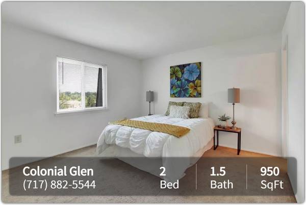 About the community: Colonial Glen, where quality and comfort meet! We offer a variety of apartment homes from 950 to 1050 square feet of living space. You will find yourself ideally situated close to I-81 and I-83 with an easy commute to Hershey Park and Medical Center!