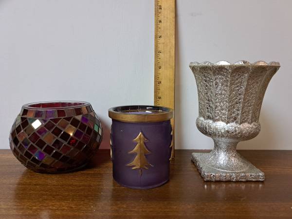 3 Empty Christmas Candle Jars. One vintage silver pedestal candle jar, 1 mosaic and one glass. Will also include a tall wine glass style votive holder if you want it too. $ 9 for all 3. Pet and smoke free home. Pick up in the Rutherford Heights area of Harrisburg, PA. No shipping.