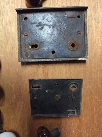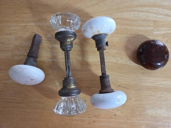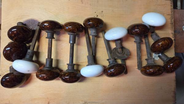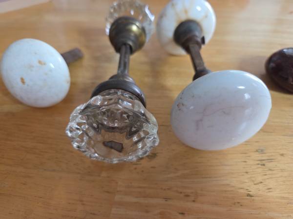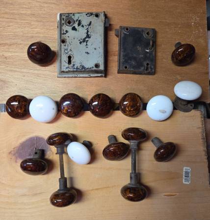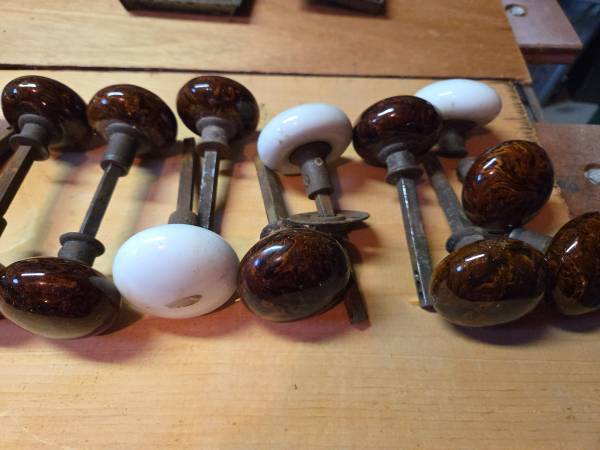 also 2 extra brown tigers eye doorknobs; one white knob on an unusual triangular spindle.