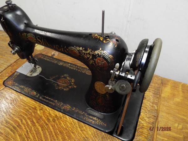 The machine is completely serviced. The machine sews very well on slow or fast speed and it also sews leather, The entire machine has been cleaned, lubricated and has some brand-new parts. Timing has been checked. The machine moves very easily and freely. Overall, the machine is still in good condition for the age. The back-plate and the fancy scroll nickel face-plate are both in good condition. The table top and the bottom iron treadle in good condition,
