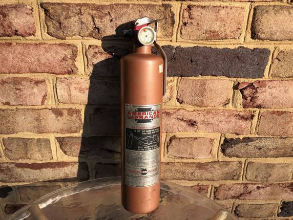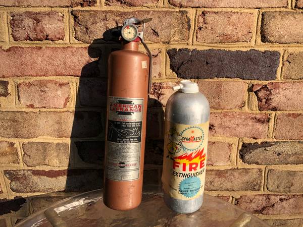 Vintage American LaFrance Fire Extinguisher (brass copper) and local SpraMaster Fire Extinguisher.