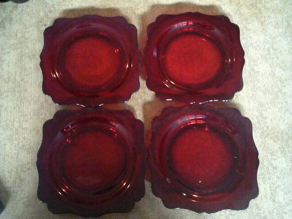 This is for a nice vintage ruby red dinner set. It includes: 4 plates, 8 cups with saucers, a milk and sugar bowl. Please see the attached pictures. Thanks.