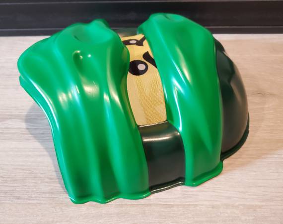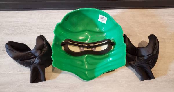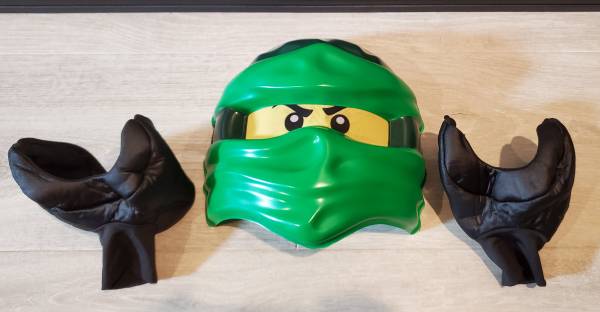 Like new, Lego Ninjago green ninja Lloyd plastic mask with elastic strap and black Lego hand gloves. Gloves turn hands into black Lego pieces, with hole in middle to pop hand through.