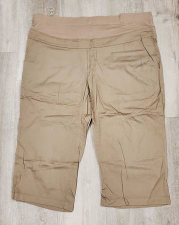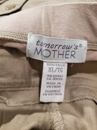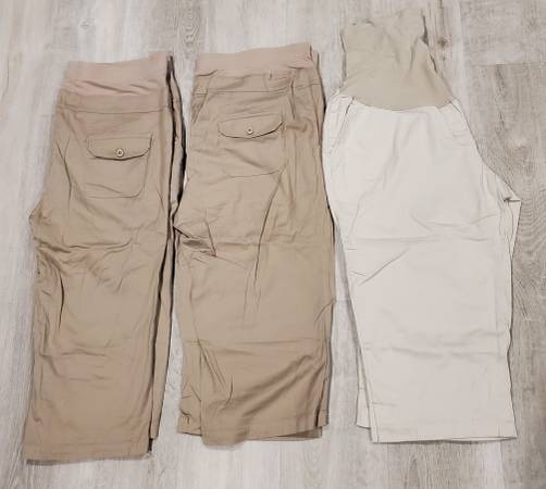 In good condition, 3 pairs of capris, size XL, $10 each or 3 for $30. See photos. (2) Tomorrow's Mother camel tan capris, with front and back pockets, stretch under belly waist band. Motherhood...