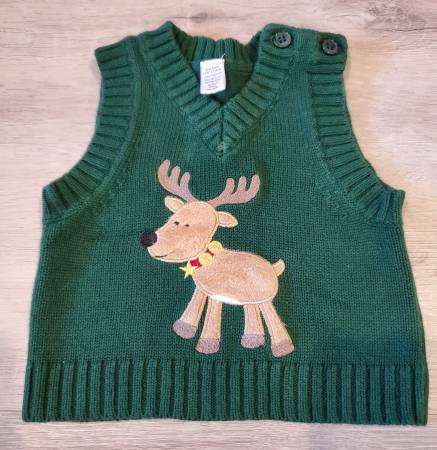 Like new, reindeer sweater vest, boys 3-6 months, green with embroidered reindeer, button at shoulder. Email to arrange pick up in Shermansdale, cash only. From smoke/pet free home. Will delete when...