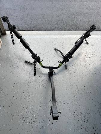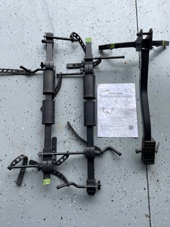 Tilting hitch v-rack. For use on car, truck, or RV. Mounts on a vehicle rear hitch (not included). Lightweight rack at 24 pounds. We originally bought it to go on our RV bumper, which was weight restricted. But we sold the RV, so don’t need the lightweight bike rack anymore. Includes all parts and instruction manual. Works great.
