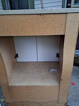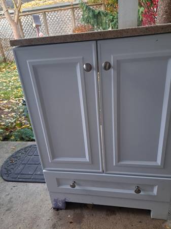 Sink is MINT and cabinet that I decided not to go with for remodel. doors open and the drawer on the bottom slides nicely. the sink sitting on top is removable right now. sink i believe is a faux marble. the white part on the front has a nice texture/ coating that is super easy to keep clean. it is in mint shape (the sink part!) the white cabinet has a few issues. purple paint splattered at the bottom left and a little issues around bottom edge at spots as shown. measures 35 " high including the sink, 19 across and 24.5" long. See all photos please for condition at the bottom... pick up Liverpool.
