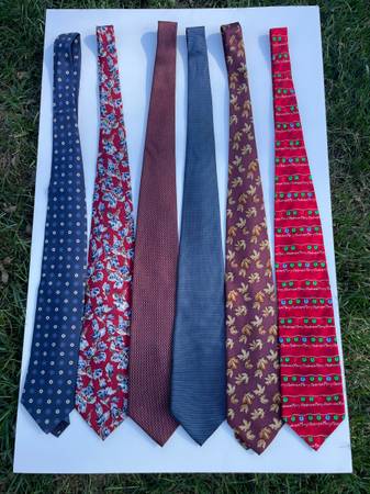 Ties are in excellent/like new condition. Each tie has been worn once or twice. Selection includes a tie for each season; flowers/Spring & Summer, Leaves/Fall and Christmas lights. Three ties are more traditional. Ties are made in the USA. Two from Lands End, two by Peter Thomas, Wembly and MMG by Hallmark Licensed.