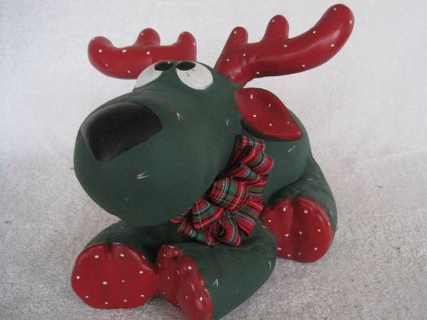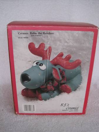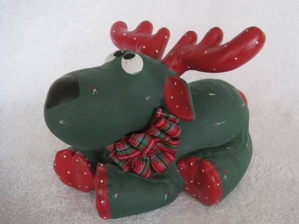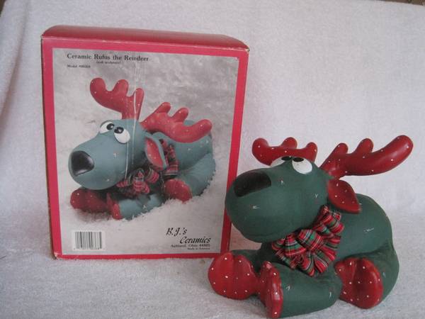 This vintage 1980's hand-painted ceramic Christmas reindeer was made in the USA. It is 10" long and 7.5" high. One of the antlers has been repaired but the repair is hard to see (see last photo).