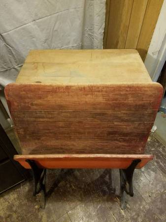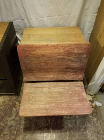 Old hardwood school desk with seat that folds up has cast iron legs. 100 years old vintage desk.