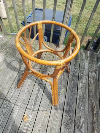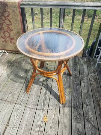 Bamboo base with a round 28 inch glass top table in good condition. Can be used with or without the metal ring around the glass top.
