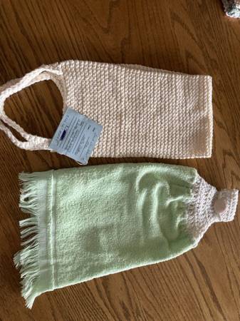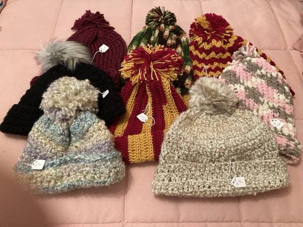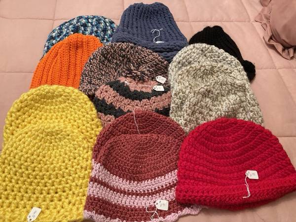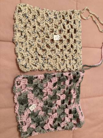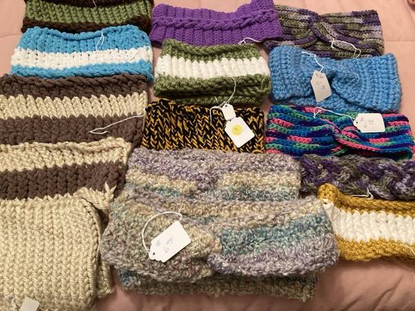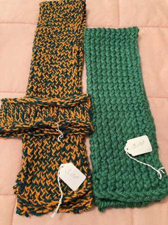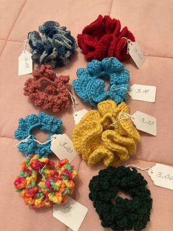 Scrunchies, Ear Warmers, Hats, Scarves, Fingerless Gloves, Small Crochet Vegetable Bags, Hot Pads, Back Scrubber and Hand Towel All Hand Made Scrunchies - $2.00 Ear Warmers - $4.00 Hats - $4.00 to...