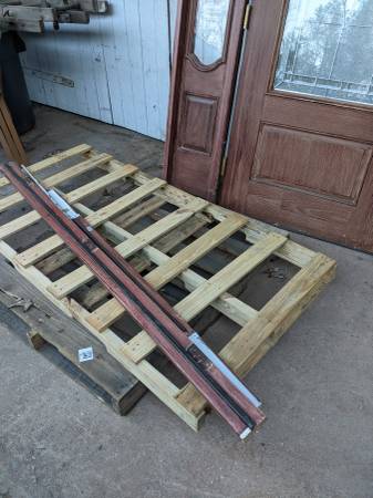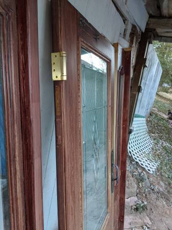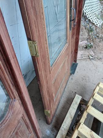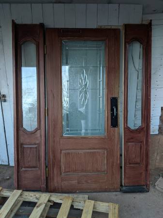 This door is in good condition. The door is 36 in. across and 80 in. tall. The right side framing panel is 12 and 1/2 in. wide and 82 in. tall and the left side framing panel is 14 and 1/2 in. wide and 82 in. tall. Additional framing pieces come with the door. Hinges on the door are in like new condition. The door is priced at $40 or best offer. For more information, please contact the owner at show contact info