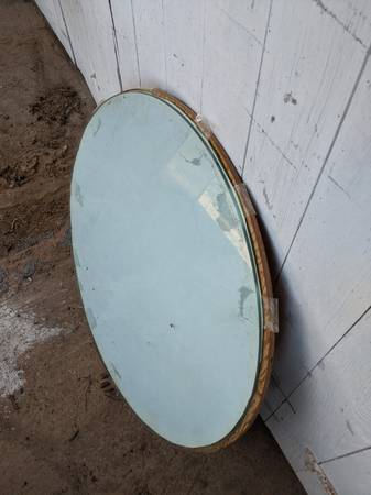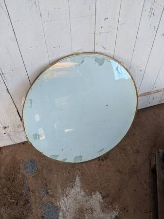 This glass table is in good condition. It's just under 31" in diameter. It's taped to a piece of plywood for transport and to use as a base support during use if preferred. Or you can remove the plywood. The glass table is priced at $10 or best offer. Please contact the owner at show contact info
