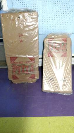 Theses are new corrugated pizza boxes sealed in plastic in two different sizes 12 and 16. 12x12, 16x16. They were left of our restaurant after we close the business asking $35 for the 2 sizes