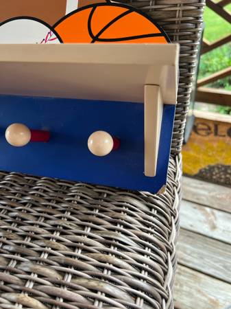3. Sports shelf with hooks (see photos for specific measurements). Note there is a small chip in the bottom right corner of the shelf.