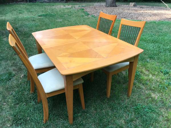 It comes in used condition but is made of very sturdy & heavy wood. The table and chairs do have some signs of wear, such as minor nicks and scratches, but overall nothing terrible. The upholstered seats have stains and would need to be cleaned or recovered. The table top itself is 40x60 inches, and stands approximately 29 inches tall. The table is expandable but the center leaf is missing. The legs can be unbolted from the table making it easier to move.