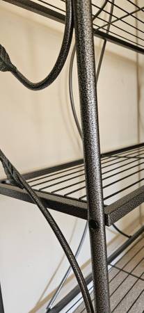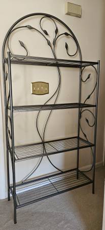 Absolutely beautiful baker's rack. Silver in color with lovely leaf pattern. Four shelves. In very good condition. Dimensions are 71.5 in H 12.5 in D 34 in W. Must pick up, you'll need a pickup...