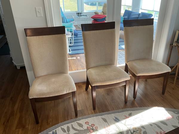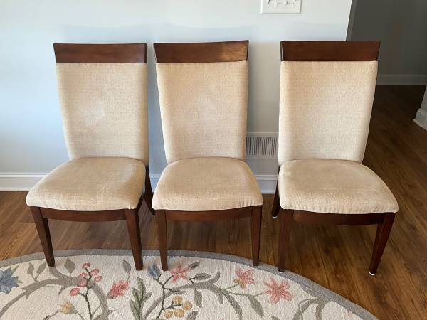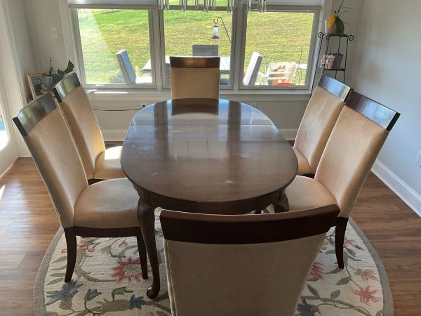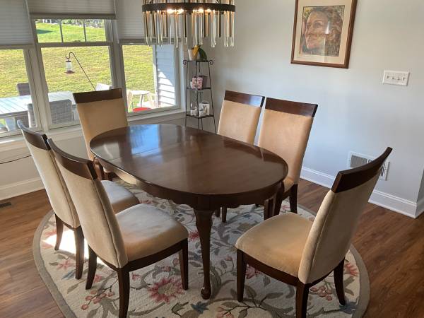 Dining room set. Cherry finish. 60”x42” with 2 12” leaves. 6 high back chairs. Good condition. Pick up only.