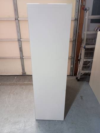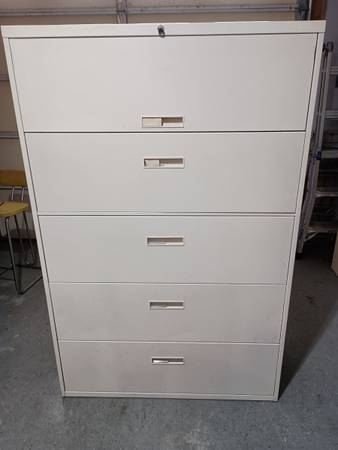 This is for a really nice locking 5 drawer metal lateral file cabinet. It measures about 42" long by 18" deep by 65" tall. Yes, it does have a key. Please see the attached pictures. Thanks.