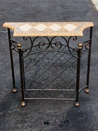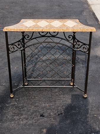 This is for a really nice wine storage rack with a mosaic tabletop and an iron base. It measures about 32.5" long by 12" wide by 29.5" tall. Please see the attached pictures. Thanks.