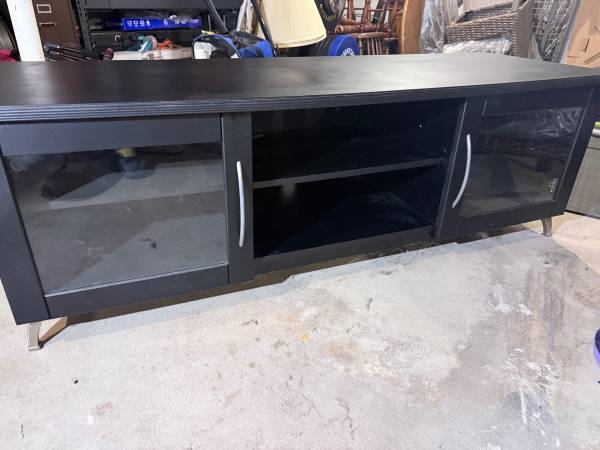 TV stand, black, has 2 cabinets with glass doors.