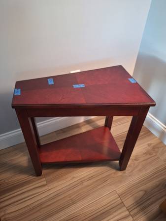 Two cherry end tables with unique triangle shape with two tiers of shelving.