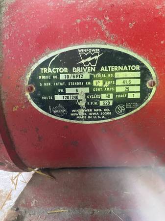 6k/9k pto (540) driven generator. Works well. I ran it with 50 hp tractor no trouble. I bought a bigger one to run the whole house, that’s why I’m selling this one. 717-7one3-0five 88.