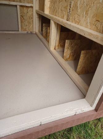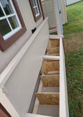 The Chicken Coop is Quaker style and is 4' deep, plus about 15" for the nesting boxes. Nesting boxes are accessible from the exterior and interior side. The coop has 2 windows , Back wall vent door, Roosting Rail, chicken door and Nesting boxes.