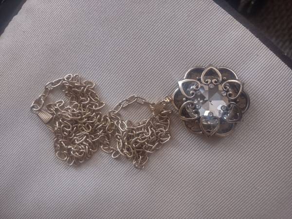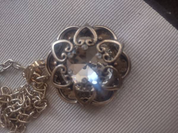 This is a striking flower-inspired necklace pendant for sale. The center stone is a huge faceted crystal. The metal is Stainless Steel in Antique Gold.