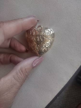 This is a whimsical, huge, 3-D engraved Puffed Golden Heart Pendant. The loop is big, so you can put it on a variety of sizes of chain worn with it AND it's child friendly for those who like to play dress up and wear jewelry like her fabulous Mommy (exaggerated in size).