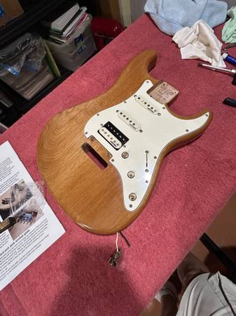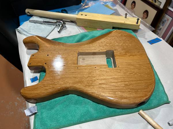 2 piece alder body with a protective sealer of CleanArmer Wood 716 polymer cured with UV light then finished with Tried & True (Linseed oil and beeswax) to a satin sheen.