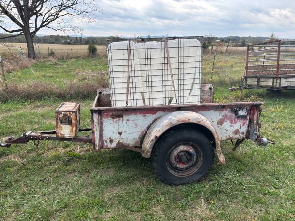 I got this Truck Bed/trailer when I bought the farm. It is in very good shape for a 70/80 year old Truck Bed/Trailer. The bed measures 80”L x 48” W. It is also a tilt/dump trailer. We used it for watering our trees (that's why you see a Tote in the back) and hauling and dumping stuff. Needs a floor and a tailgate. The tires actually hold air But I am sure you will need new ones. The tote is toast but the cage is in good shape it takes 2" ball for the hitch- No Title -