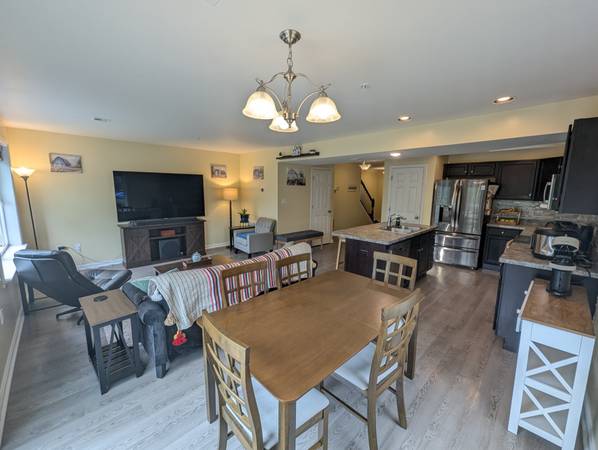 ⌂ Shared living room with 75" smart TV, chairs, futon, and dining table with chairs