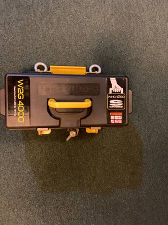 4,000 lbs synthetic rope winch inside a durable tool box mounted on a powder coated plate for portable usage