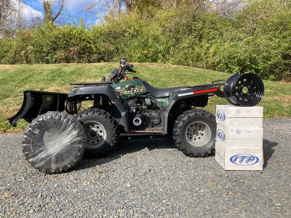 For Sale is a 1998 Yamaha grizzly 600 4x4 with plow (plow and winch used 5 times). New set of Bear Claw front tires still in wrapping. Set of new black steel wheels I never installed. Justn in time...