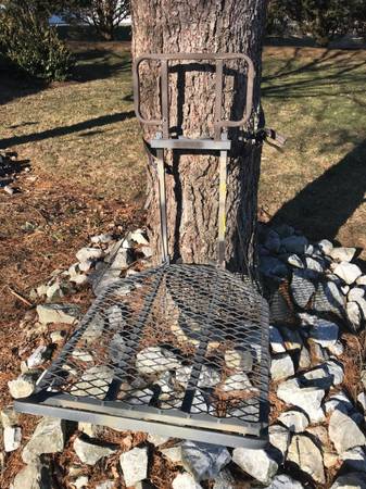 Heavy Duty Collapsable Hanging Tree Stand: Fold Down Seat. Expanded Wire Mesh Floor. Non Slip Texture. Very Stable Cam Down Feature Hands Free Harness included.