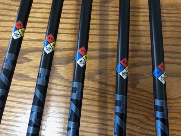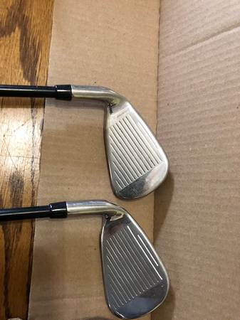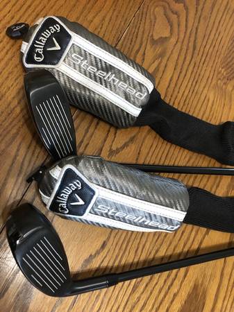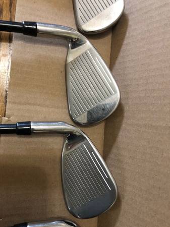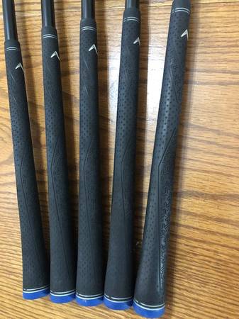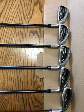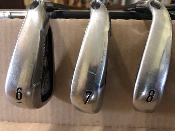 Set of Callaway Steelhead XR irons that include 6-PW (5 irons) and 2 Steelhead Hybrids (#4 and #5). These 7 clubs are +1/2 inch and have 58 gram senior shafts. Grips have good feel and are all in good condition.