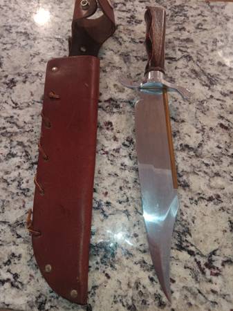 I had a wooded handle and also had stars on both sides of the knife's hilt.