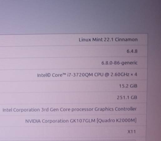 Lenovo Thinkpad W530 with Linux Mint, an i7-3720QM processor, 16GB RAM and a 250 GB hard drive. Comes with the original Lenovo charger, a second battery and a carrying case.