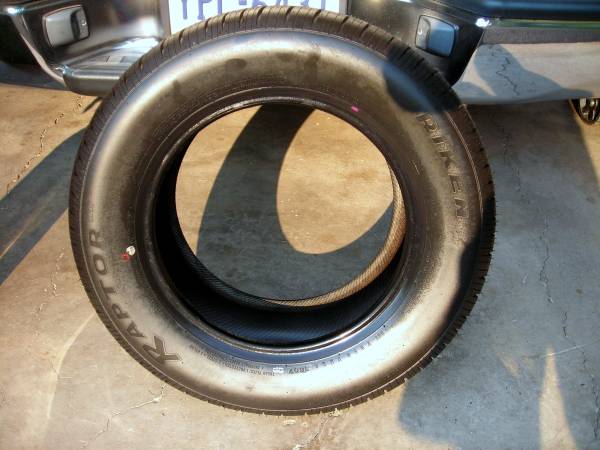 Riken Raptor tire. Size is 215-60 / R14, load / speed 91H, M&S; Treadwear 520, Traction A, Temperature A, tread plies are polyester +2 steel + nylon. This is a new and unused radial blackwall tire which typically sells for almost $100. Also have some used tires in the same size that are in pretty good shape.