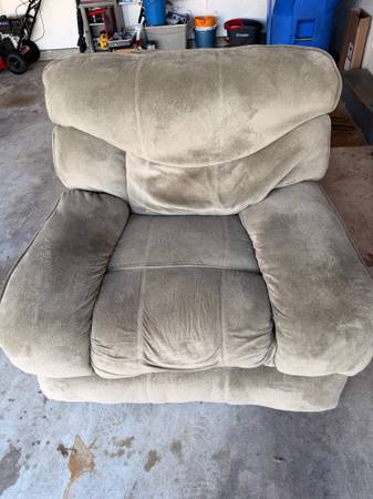 Free power loveseat and recliner. Loveseat was just put out front on curb and matching recliner is currently in the garage. They are a green-gray and both work and include power cords. Loveseat has 2 power footrests and recliner has one. Has some minor tears but is in fair condition. You must haul, they are heavy but backs are removeable for transport.